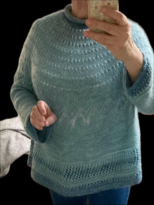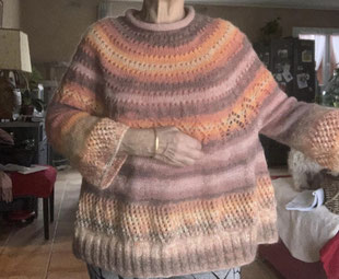 Un joli modèle de pull façon poncho, différentes qualités de laine (du mérinos et un mohair de Les Normandes Capri'cieuses), plusieurs points de tricot, et une fois le tout mélangé, on obtient ce joli ouvrage que vous pouvez porter sur une jolie jupe ou pantalon mais aussi simplement sur un jeans !