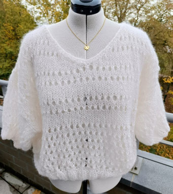 Si vous aimez le tricot à plat, en aller retour, vous allez adorer tricoter ce petit pull tout mohair de chez Le Mohair en Seille.